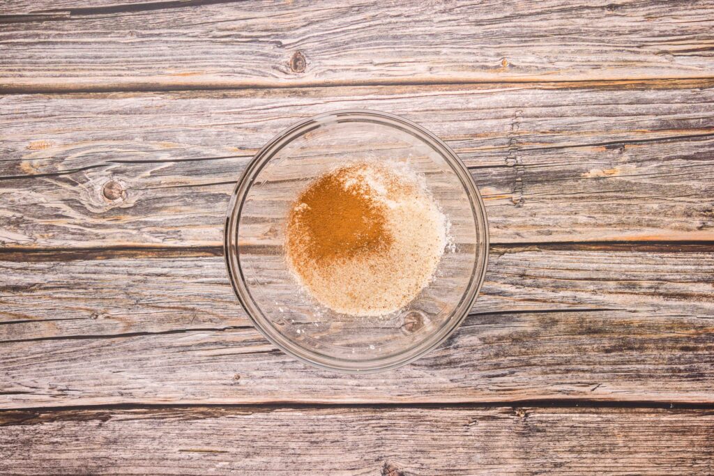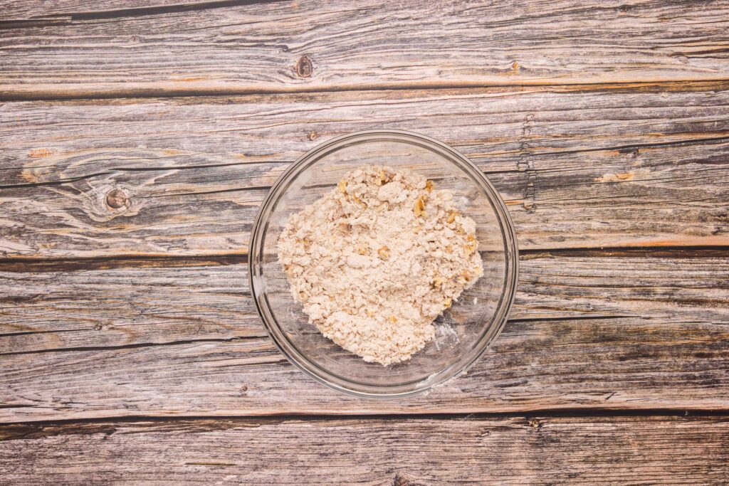 - In a small mixing bowl add the all-purpose flour, granulated sugar, salt, cinnamon, freshly ground nutmeg, unsalted butter, and sourdough discard. Using a fork or pastry cutter, cut the wet ingredients into the dry ingredients until it resembles a crumb texture.1/2 cup all purpose flour, 1/3 cup granulated sugar, 1/4 tsp salt, 1/4 tsp cinnamon, 1/8 tsp freshly ground nutmeg, 2 tbsp unsalted butter, 2 tbsp sourdough discard