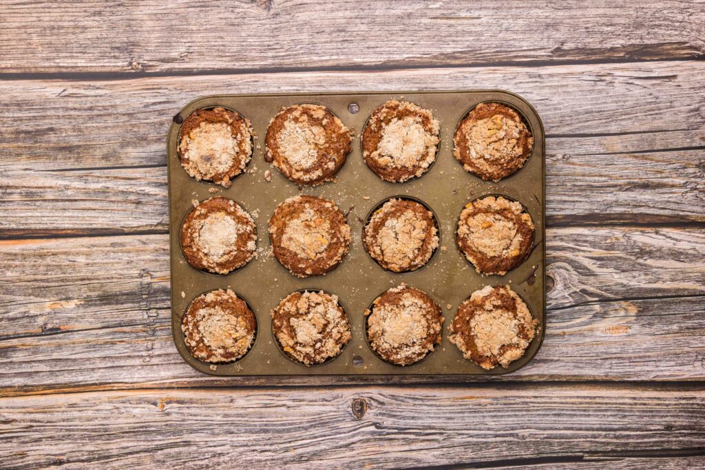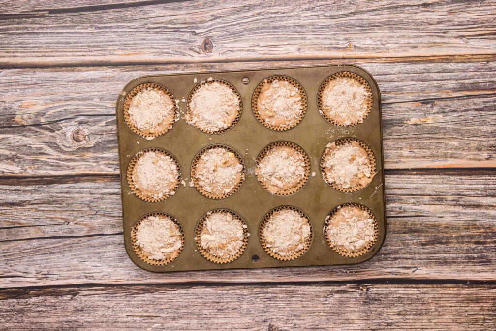 - Fill the muffin tins with the muffin batter so they're 3/4 full in each muffin space. Top with the streusel topping.