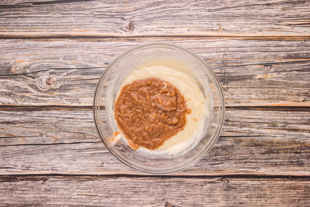 - Once the eggs are fully incorporated add the vanilla extract, applesauce, and sourdough discard, stir to combine all of the ingredients together. Set aside.1 tsp vanilla extract, 3/4 cup applesauce, 1/2 cup sourdough discard
