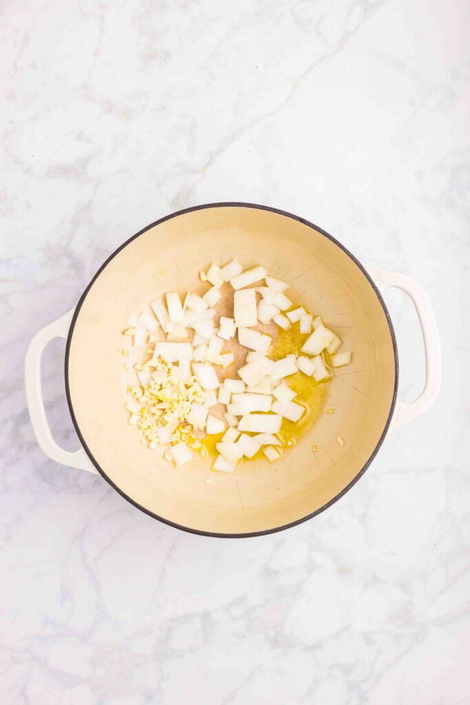 In a large pot over medium heat, add the olive oil and allow it to warm. Then add the onion and garlic. Stir to combine.