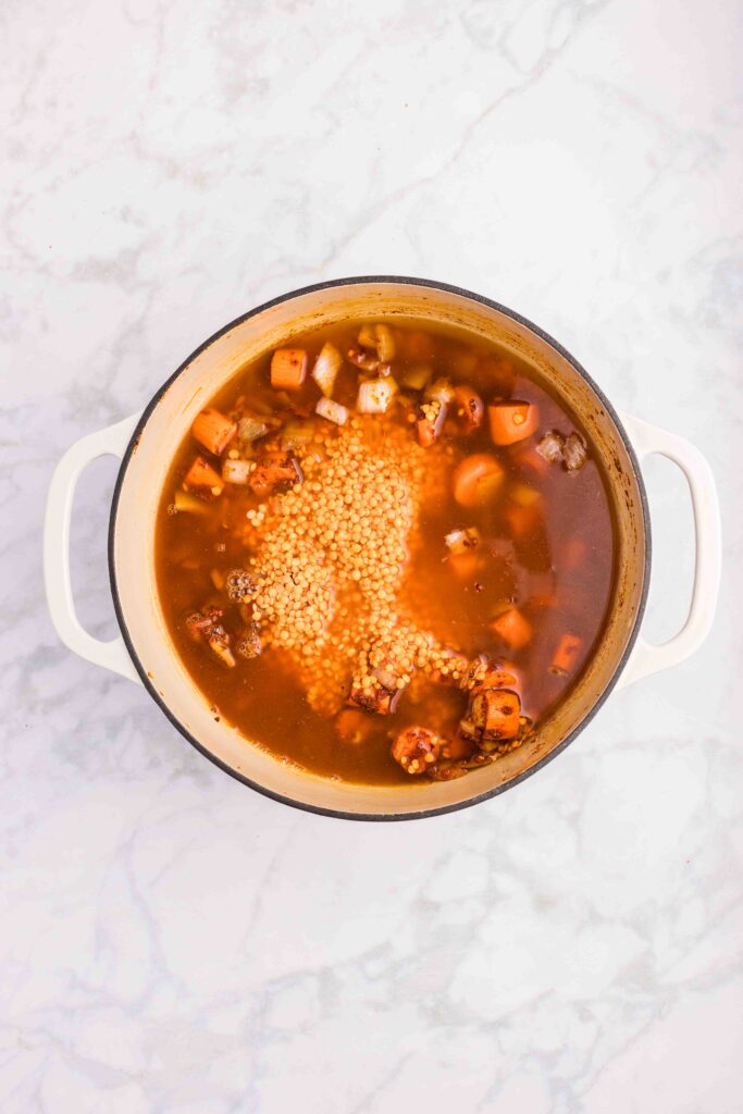 Once the mixture becomes fragrant (about 30 seconds) add the lentils and vegetable broth.