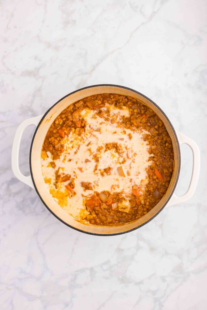 Allow the mixture to come to a boil. Once boiling, reduce the heat to simmer, cover, and allow to simmer for 20 minutes. After 20 minutes, add the milk and stir to combine.