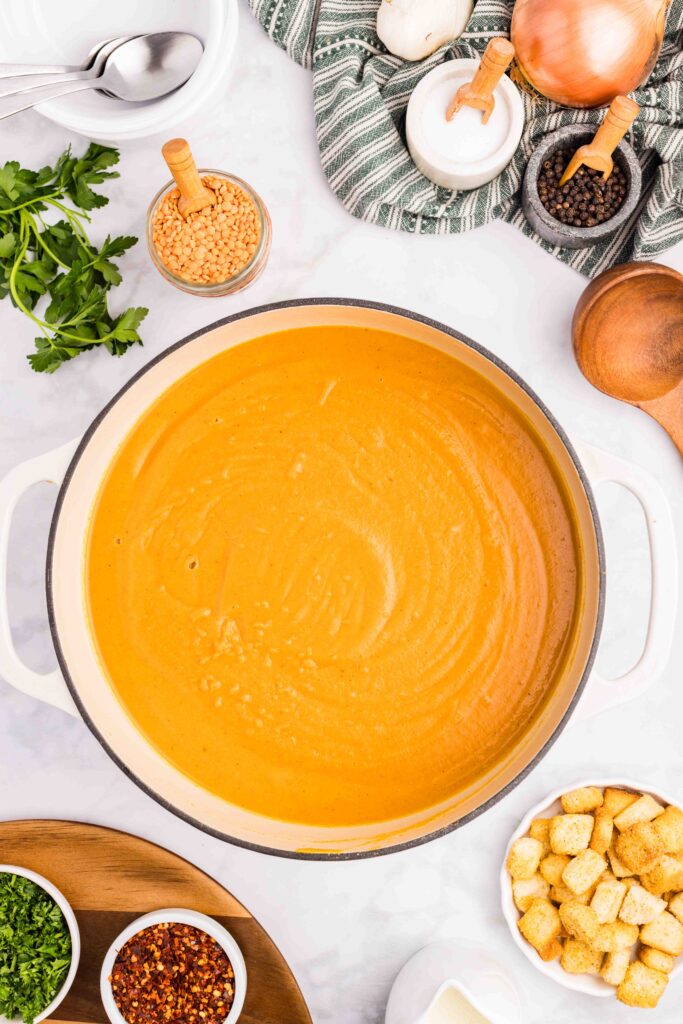 Make your soup extra creamy: This soup is simmered until the lentils and carrots are nice and tender, then blended in a high-speed blender. You can use an immersion blender or any blender you have on hand. With the use of a high-speed blender, the blending time is cut in half.